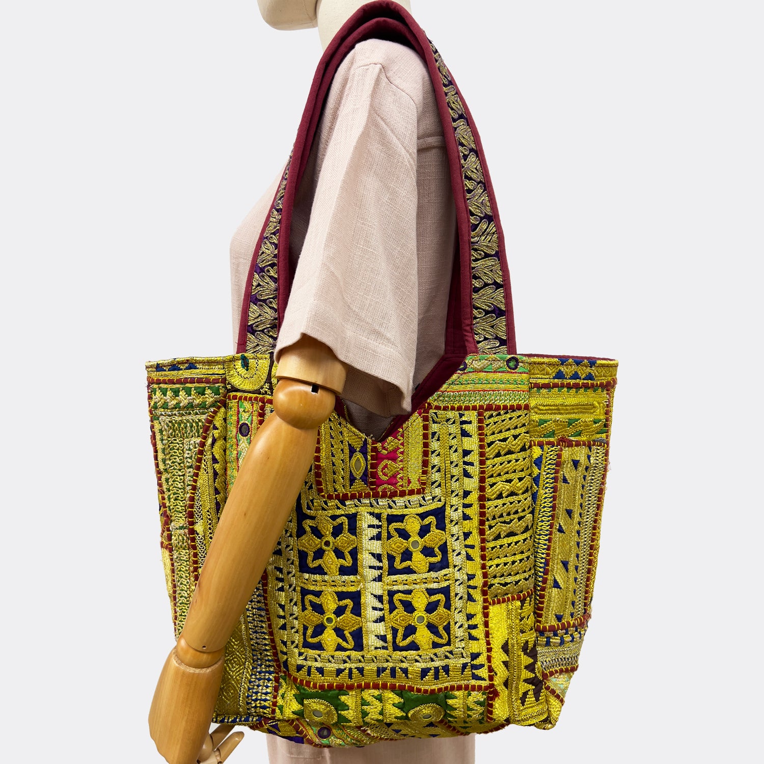 Medidas: Alto x Ancho x Fondo: 42 x 42 x 38 cm / Altura del asa del bolso: 25cm. Completamente elaborado artesanalmente con materiales seleccionados. Hecha en India.