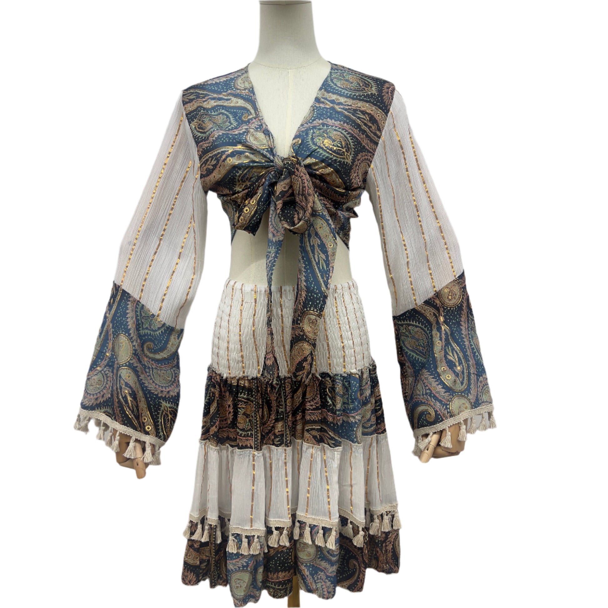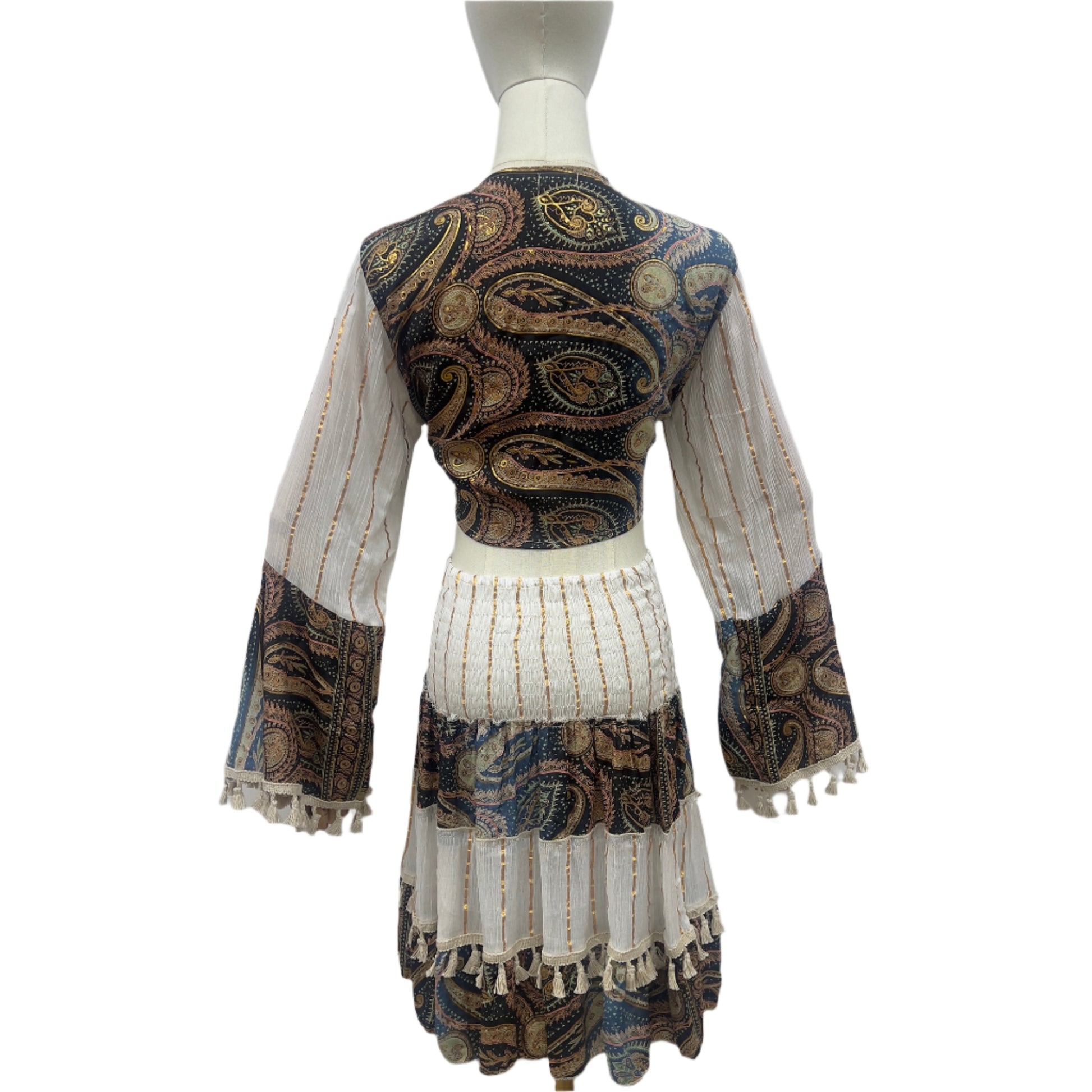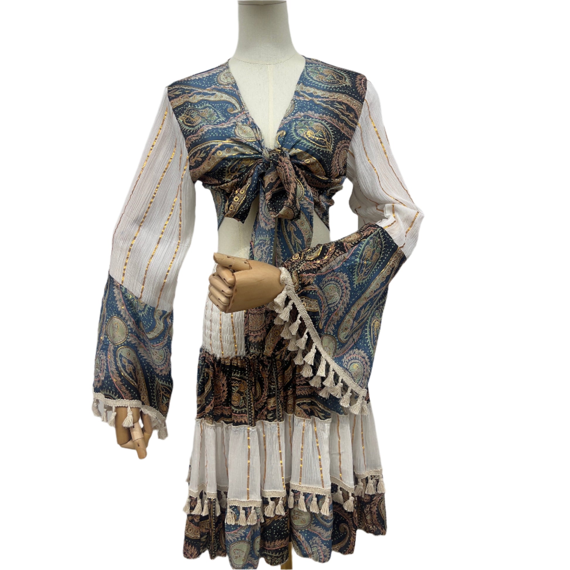 TOP / Medidas : Talla Unica / Pecho: Ajustable / Largo: 38cm / Largo de Manga: 55cm / Ancho de Brazo: 21cm / FALDA / Medidas : Talla Unica / Cintura: 30-50cm / Ancho Abajo: 100cm / Largo: 50cm / Composición: Rayon / Origen: Hecho en iNDIA/CHINA