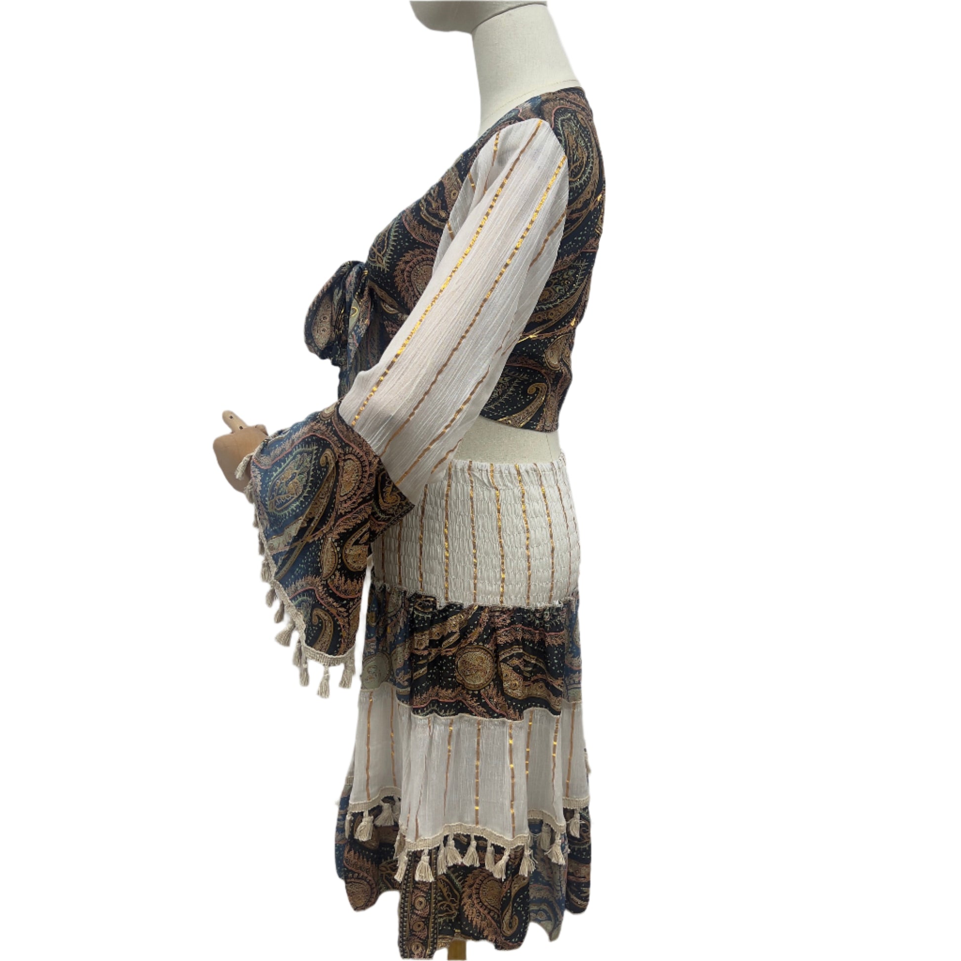 Este conjunto de dos piezas incluye un elegante top y una falda a juego de estilo bohemio. Es perfecto para el verano y las salidas a la playa, ofreciendo un look elegante y cómodo.