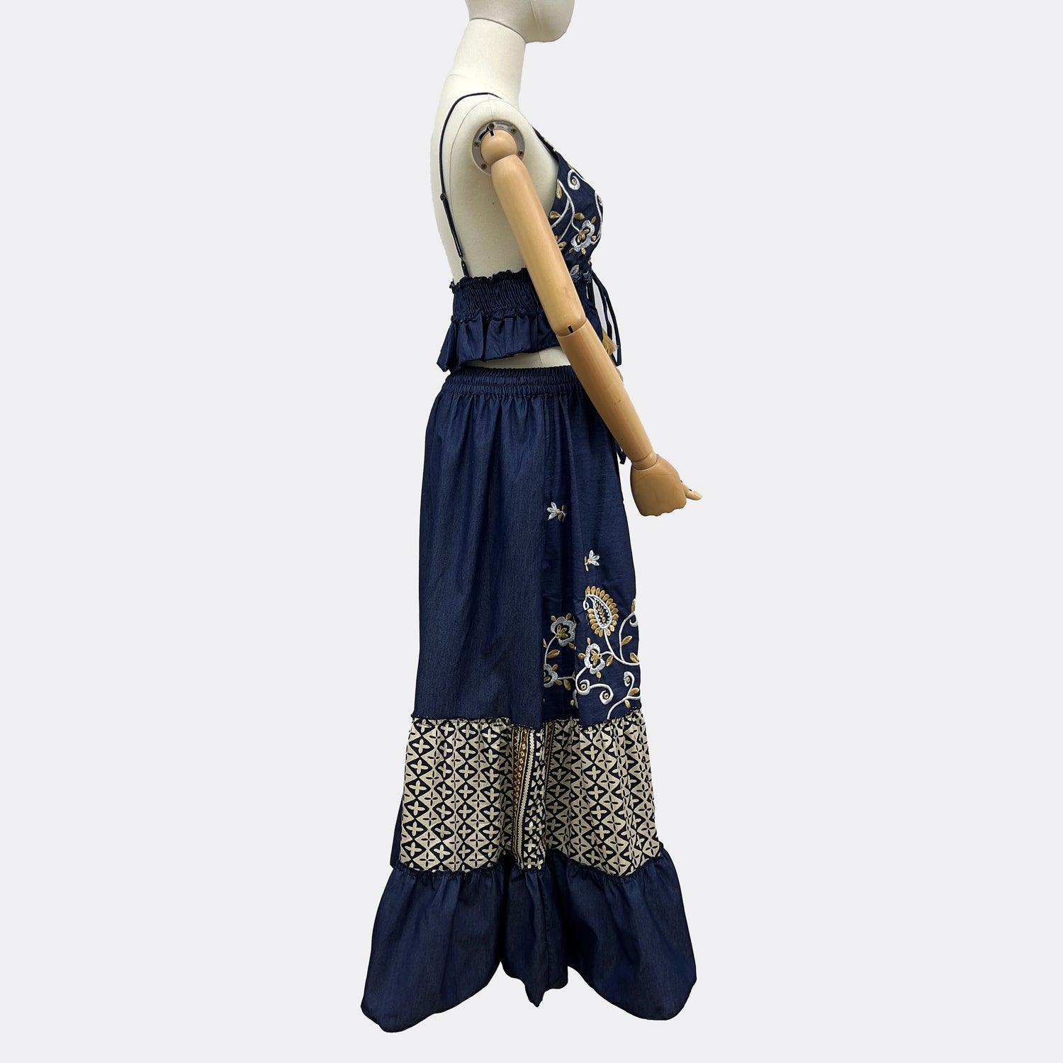 Este conjunto de dos piezas incluye un elegante top y una falda a juego de estilo bohemio. Es perfecto para el verano y las salidas a la playa, ofreciendo un look elegante y cómodo.