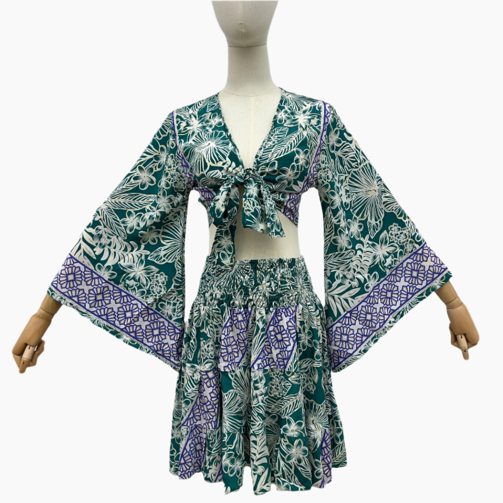 Este conjunto de dos piezas incluye un elegante top y una falda a juego con estampado bohemio. Es perfecto para el verano y las salidas a la playa, ofreciendo un look elegante y cómodo.