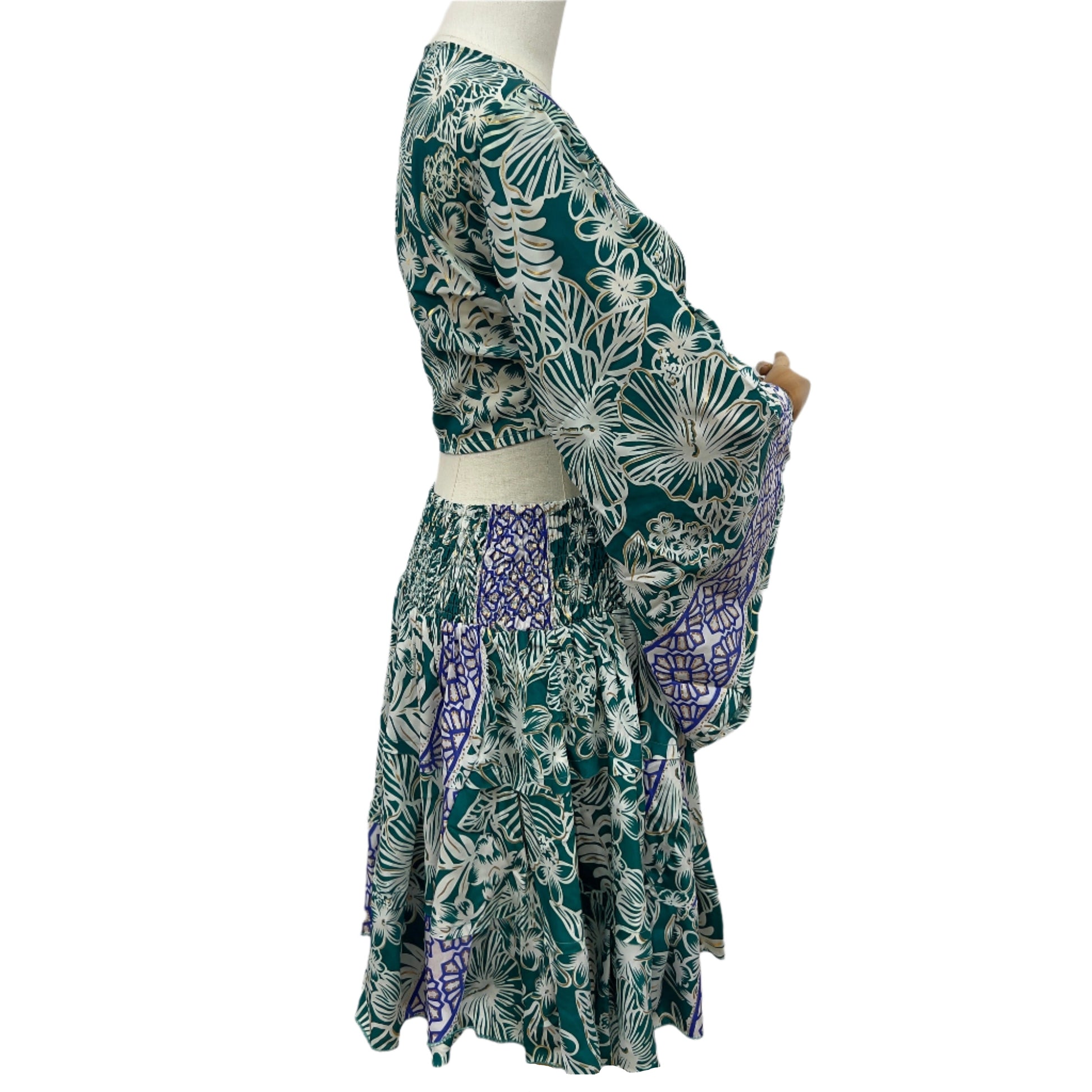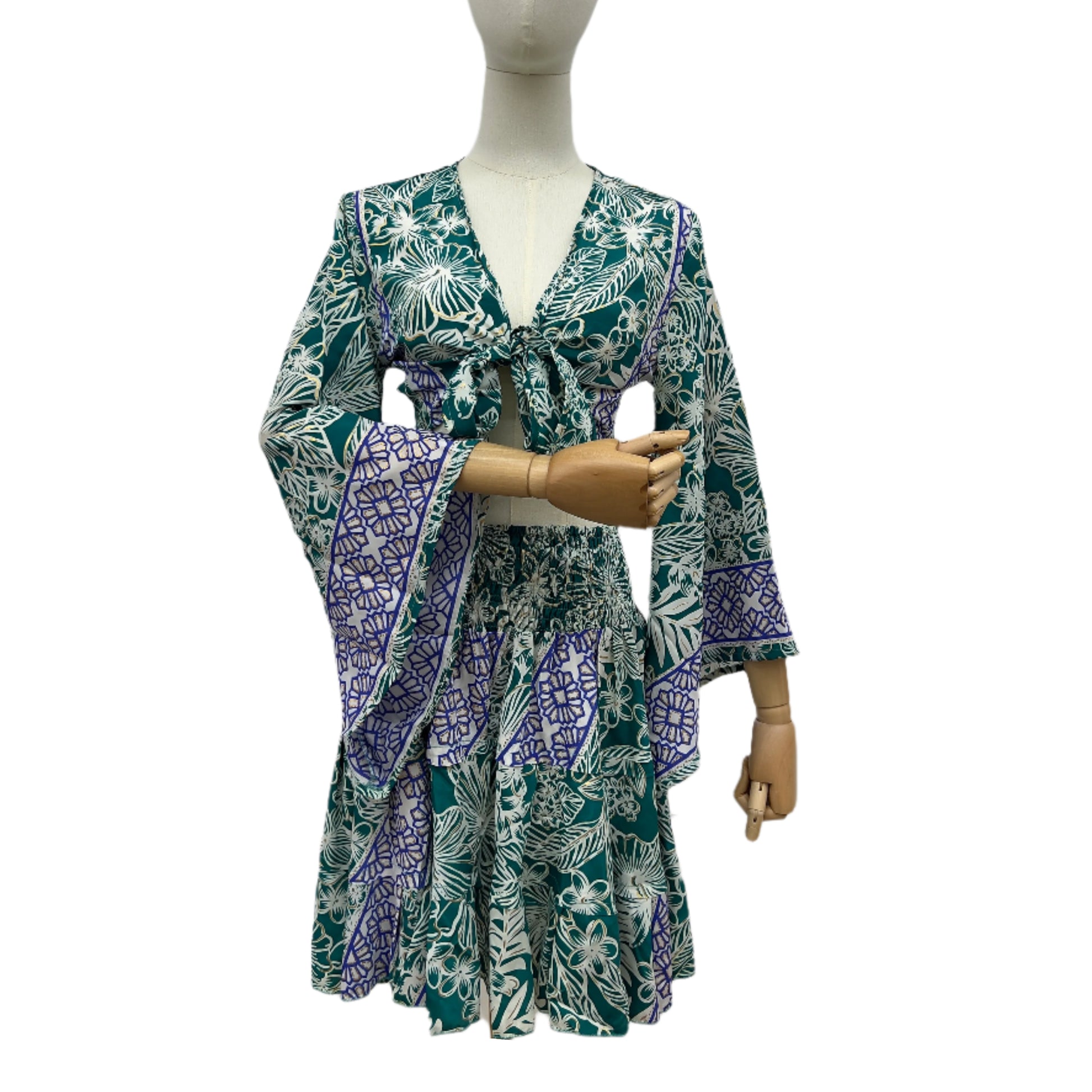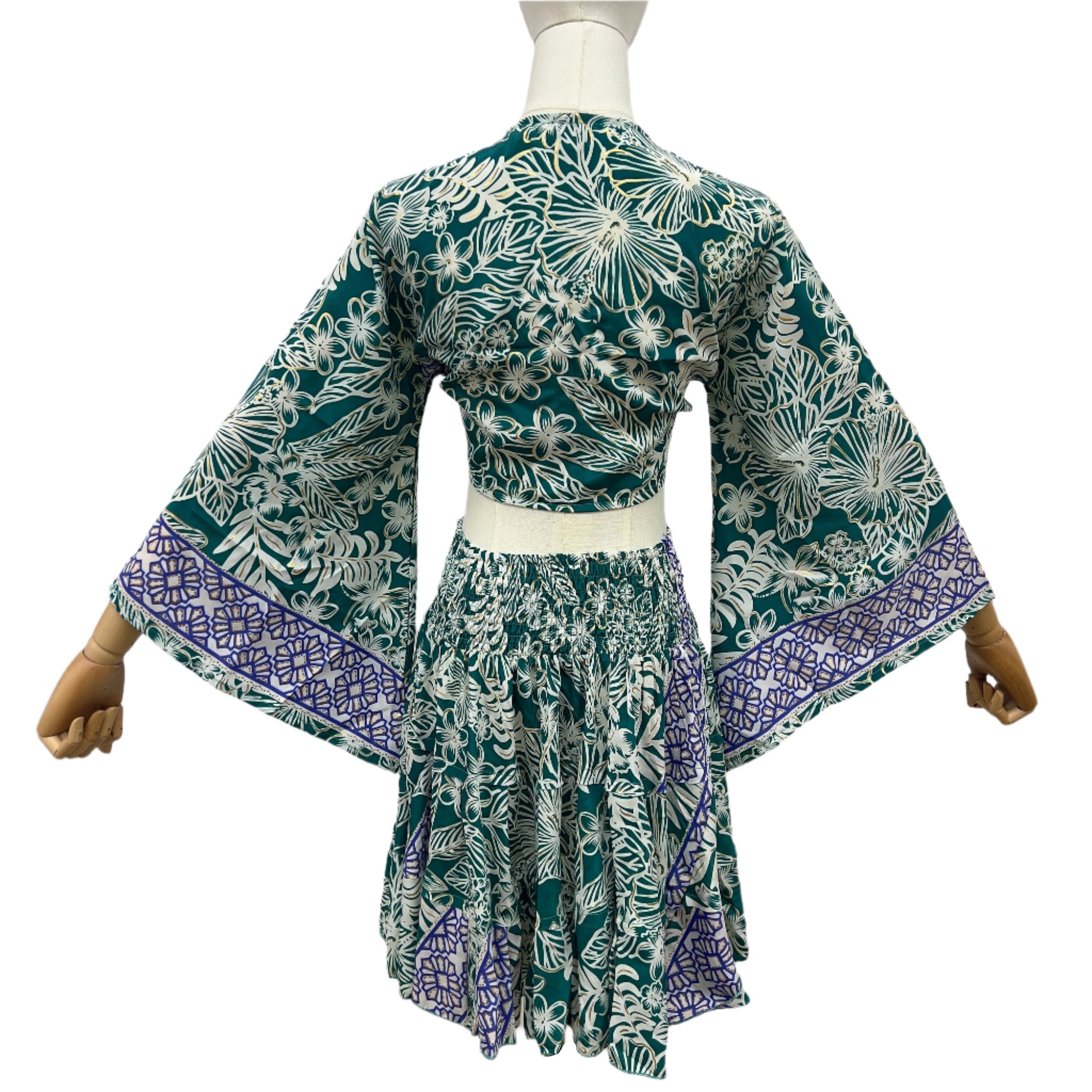 TOP / Medidas : Talla Unica / Pecho: Ajustable / Largo: 38cm / Largo de Manga: 48cm / Ancho de Brazo: 20cm / Ancho de puños: 38cm / Ancho Espalda: 40cm / PANTALÓNE / Medidas : Talla Unica / Cintura: 28-48cm / Ancho Abajo: 105cm / Largo: 48cm / Composición: Seda / Origen: Hecho en iNDIA.