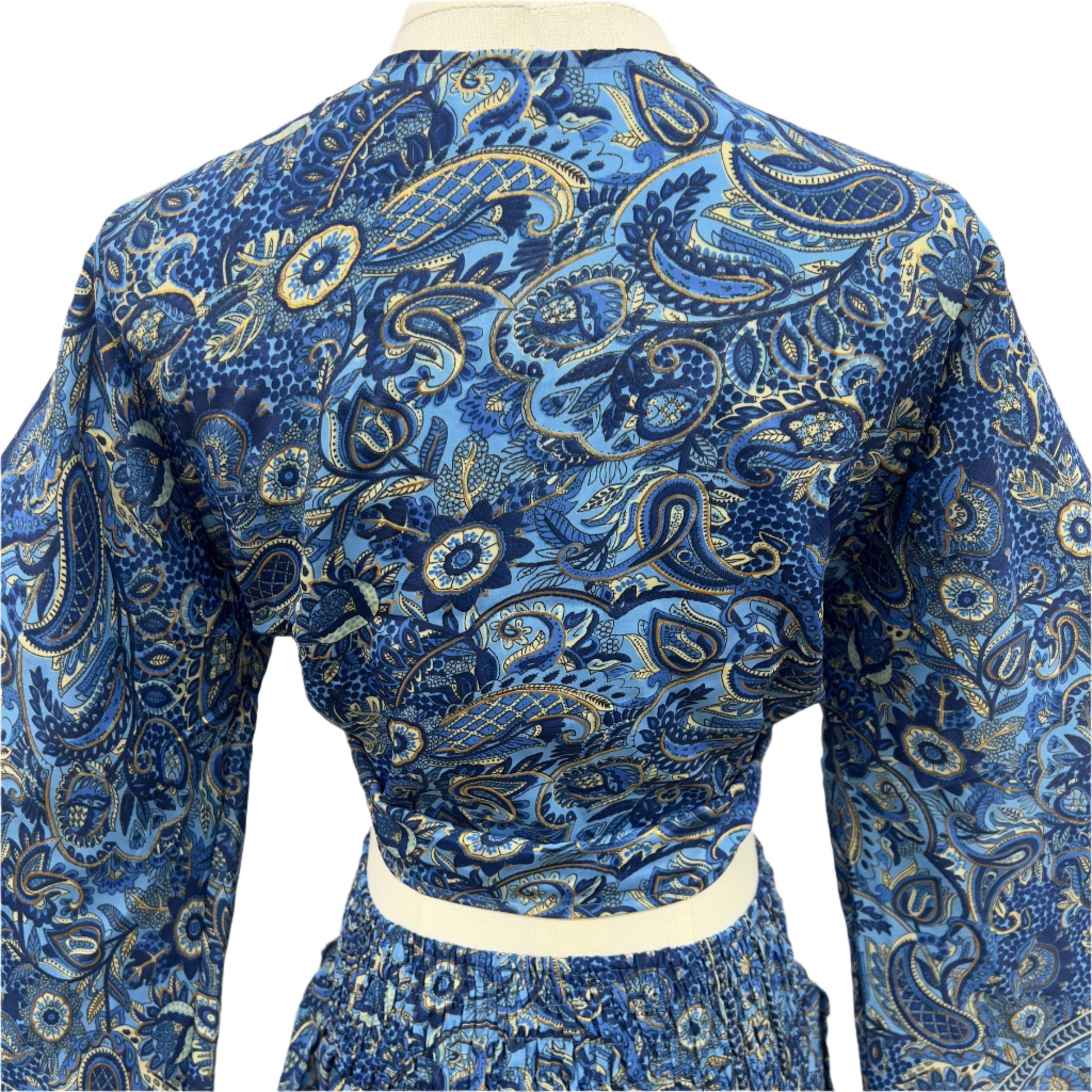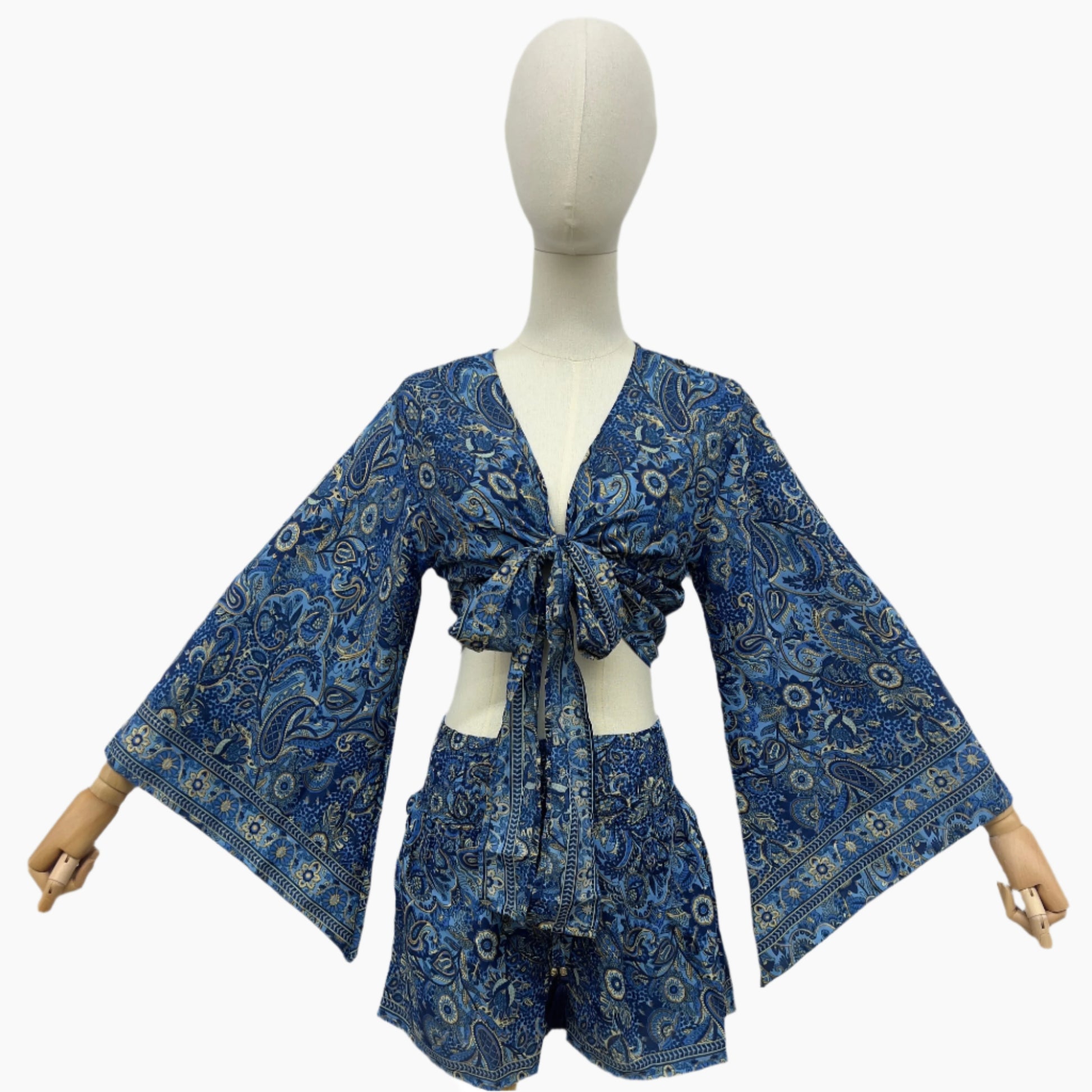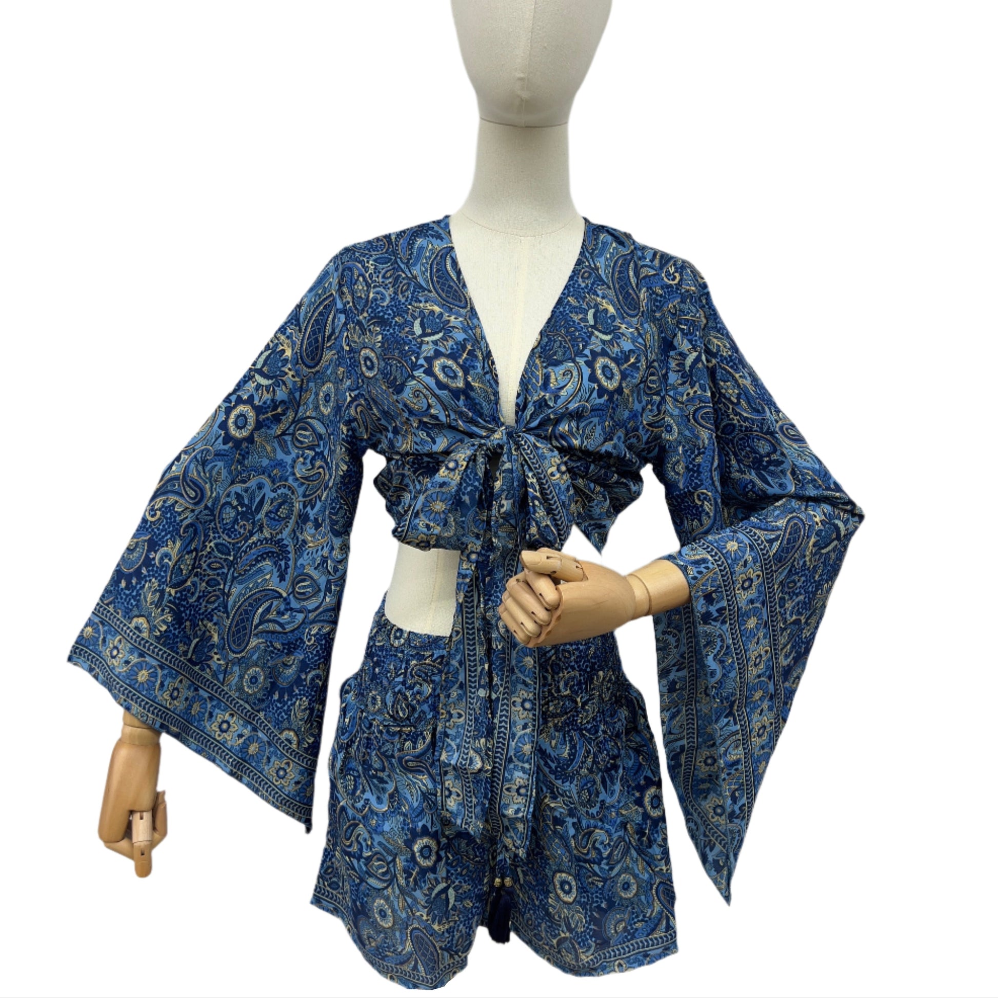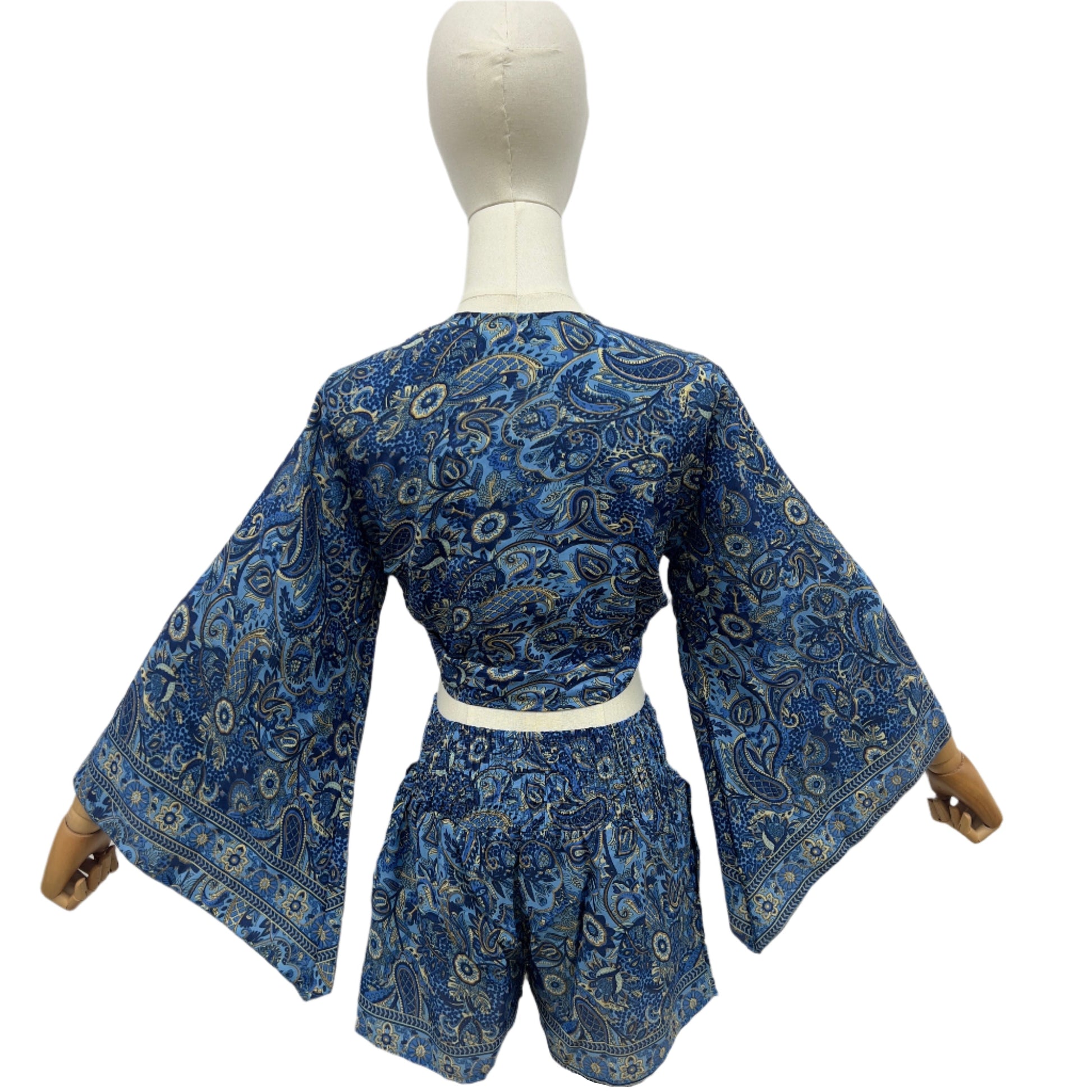 TOP / Medidas : Talla Unica / Pecho: Ajustable / Largo: 48cm / Largo de Manga: 48cm / Ancho de Brazo: 22cm / Ancho de puños: 37cm / Ancho Espalda: 38cm / PANTALÓNE / Medidas : Talla Unica / Cintura: 30-50cm / Ancho Abajo: 65cm / Largo: 36cm / Composición: mezcla de viscosa y seda / Origen: Hecho en iNDIA.