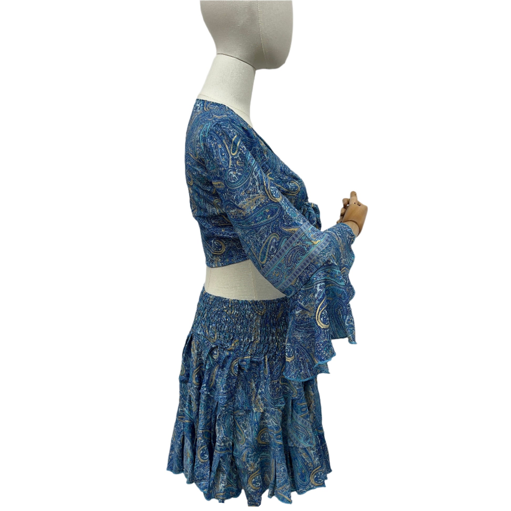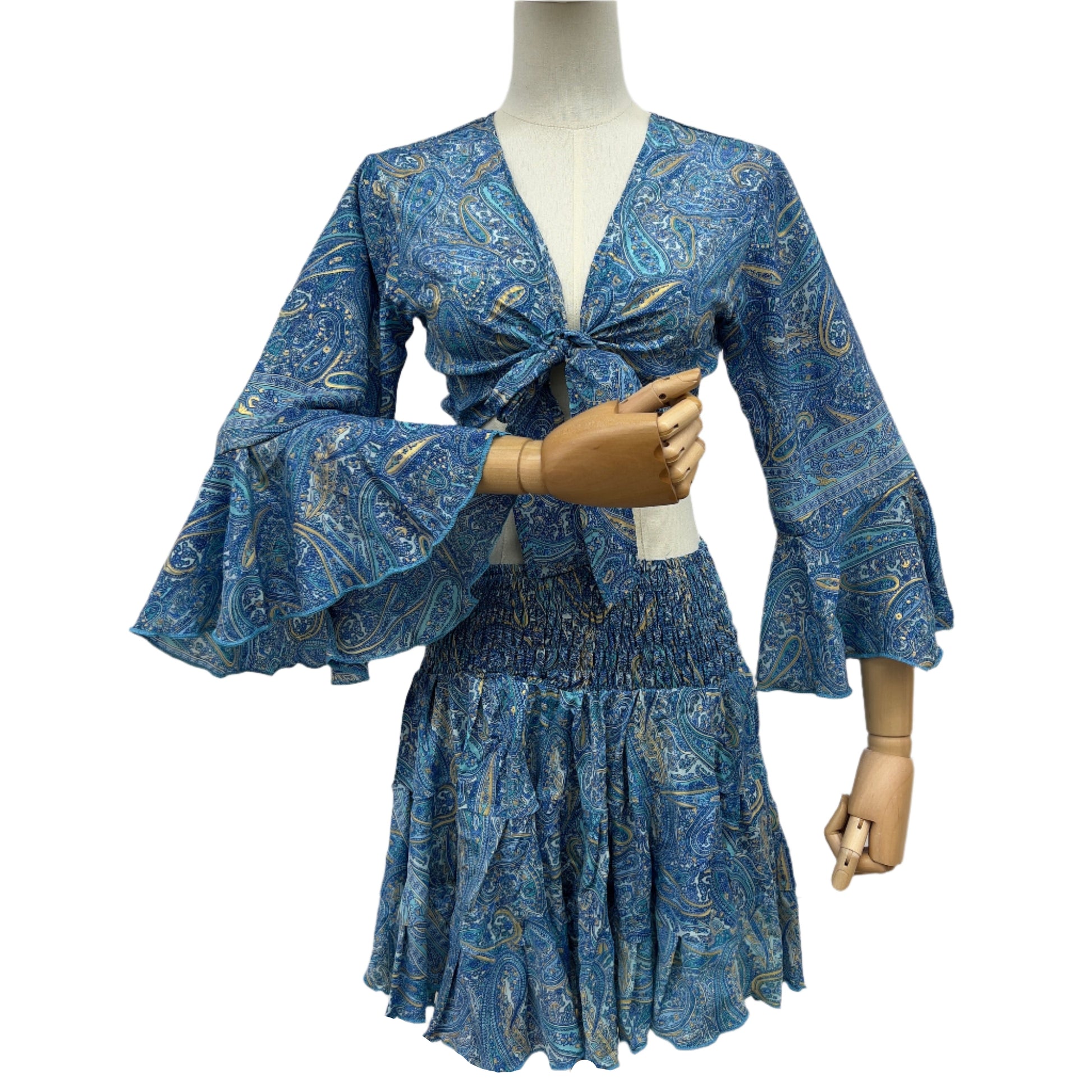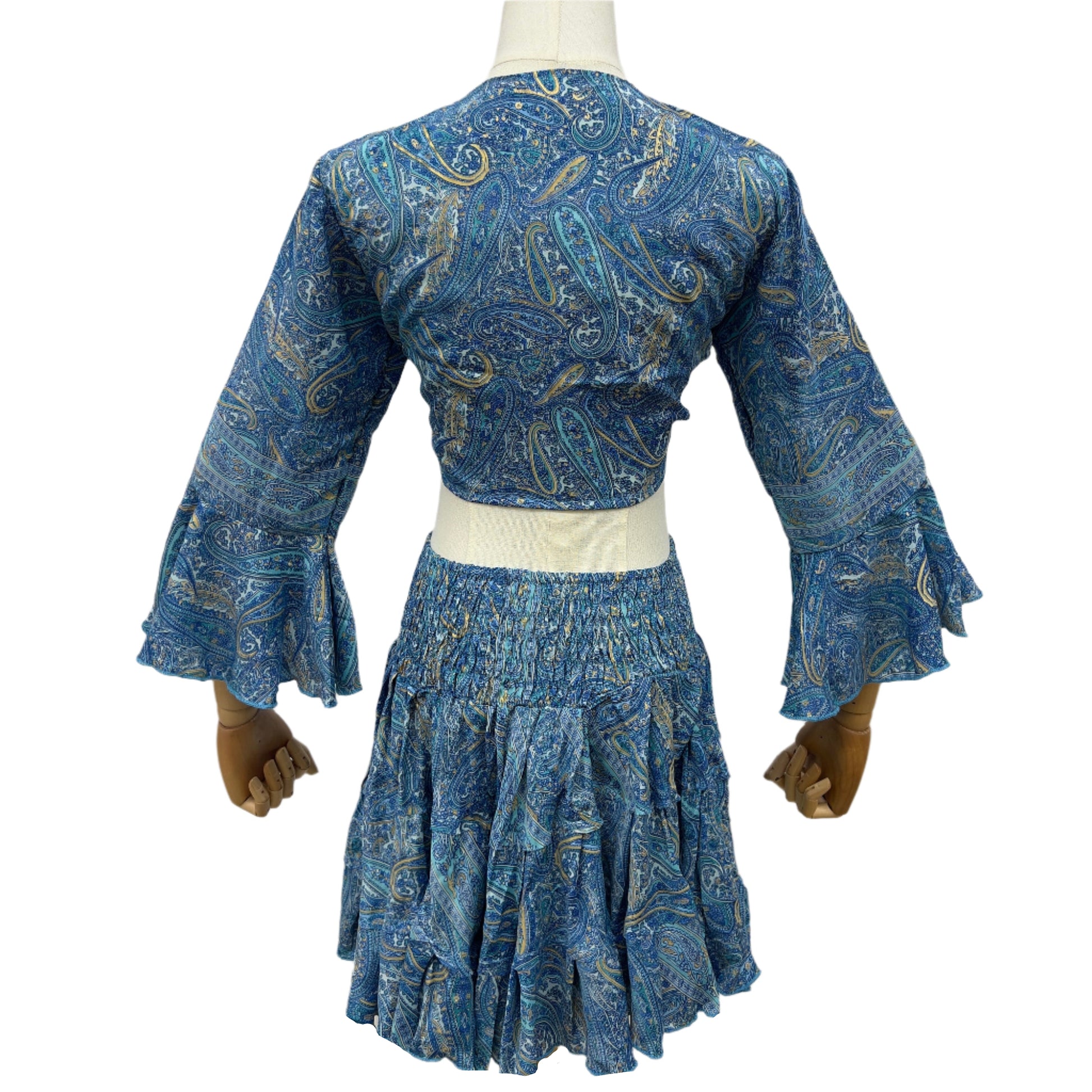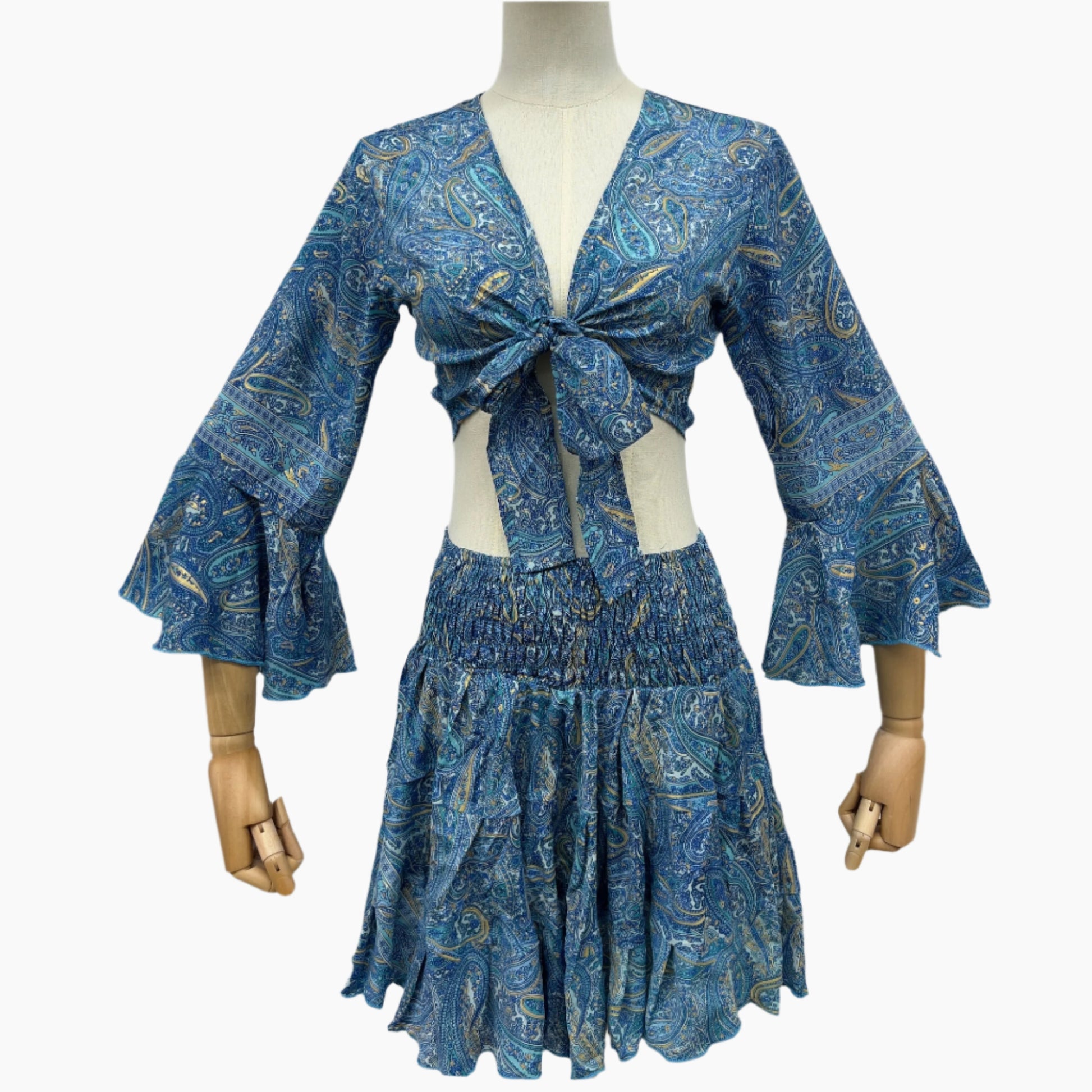 Este conjunto de dos piezas incluye un elegante top y una falda a juego con estampado bohemio. Es perfecto para el verano y las salidas a la playa, ofreciendo un look elegante y cómodo.