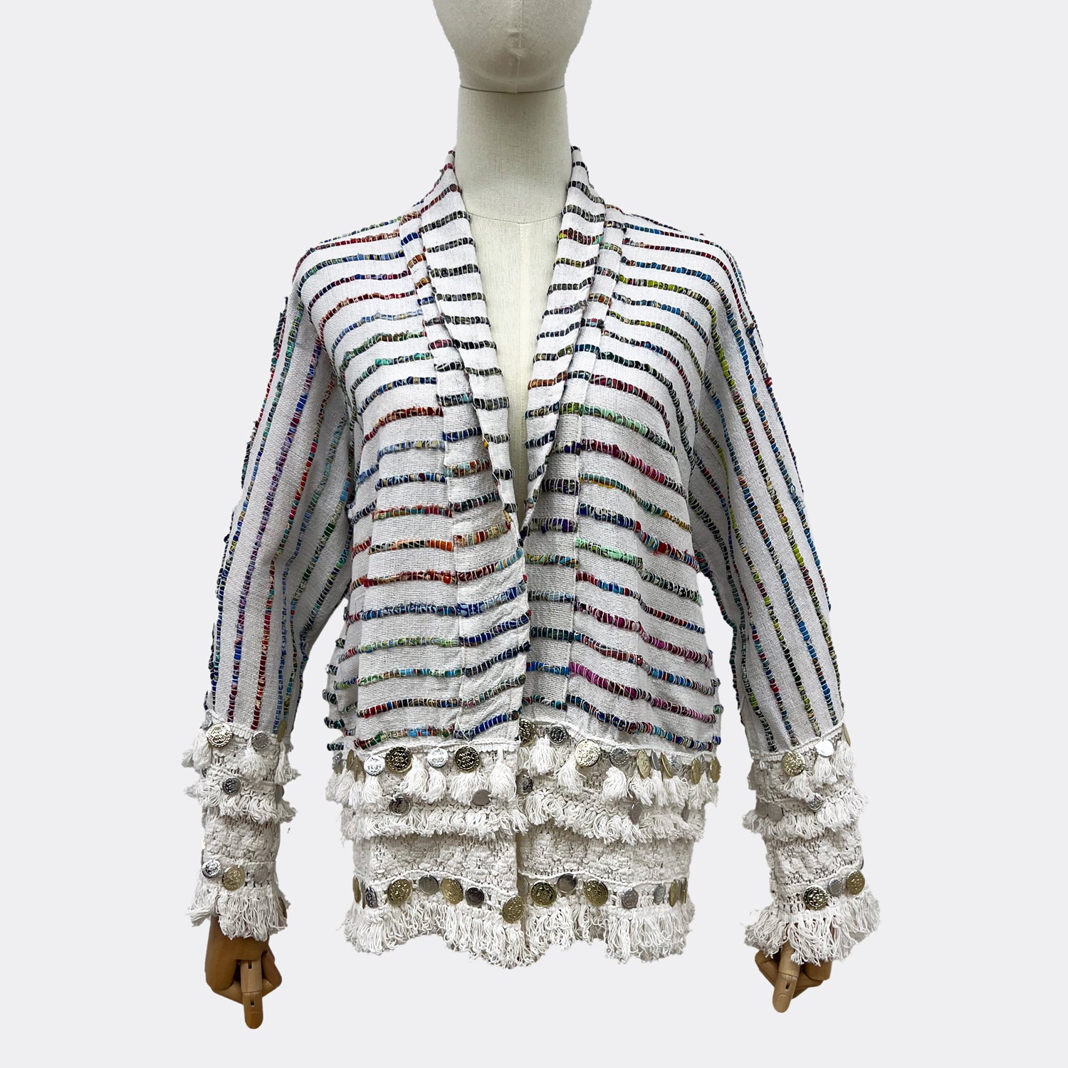 Adorable chaqueta corta de lona ligera con aire militar y ribete de crochet bohemio. Pompón y flecos de moneda estilo indio.
