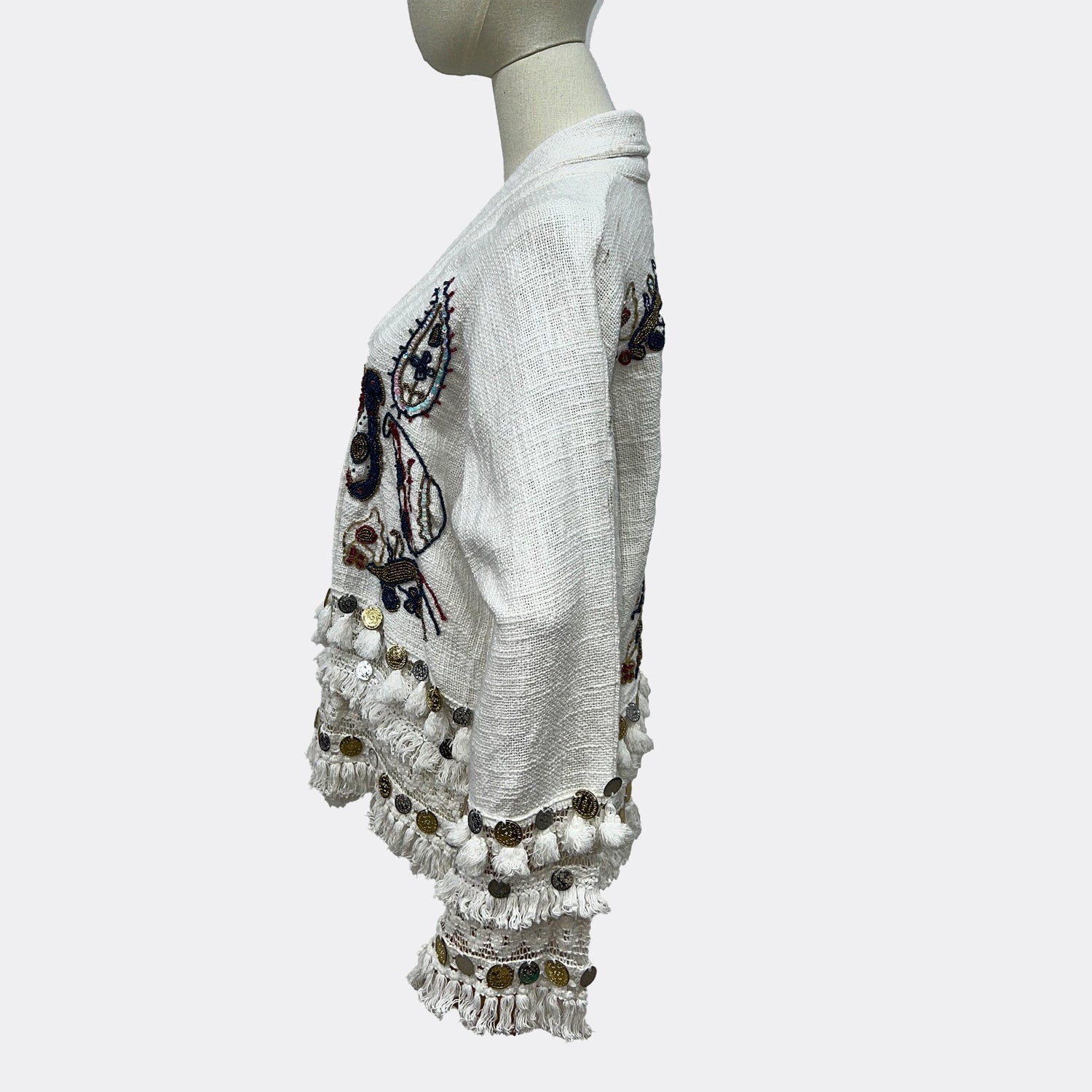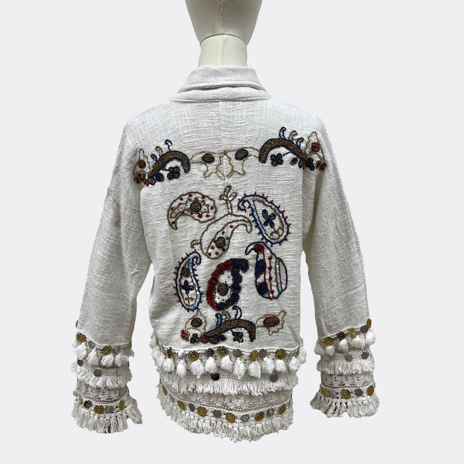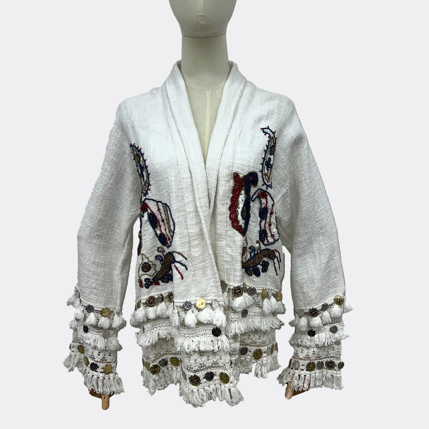 Adorable chaqueta corta de lona ligera con aire militar y ribete de crochet bohemio. Pompón y flecos de moneda estilo indio.