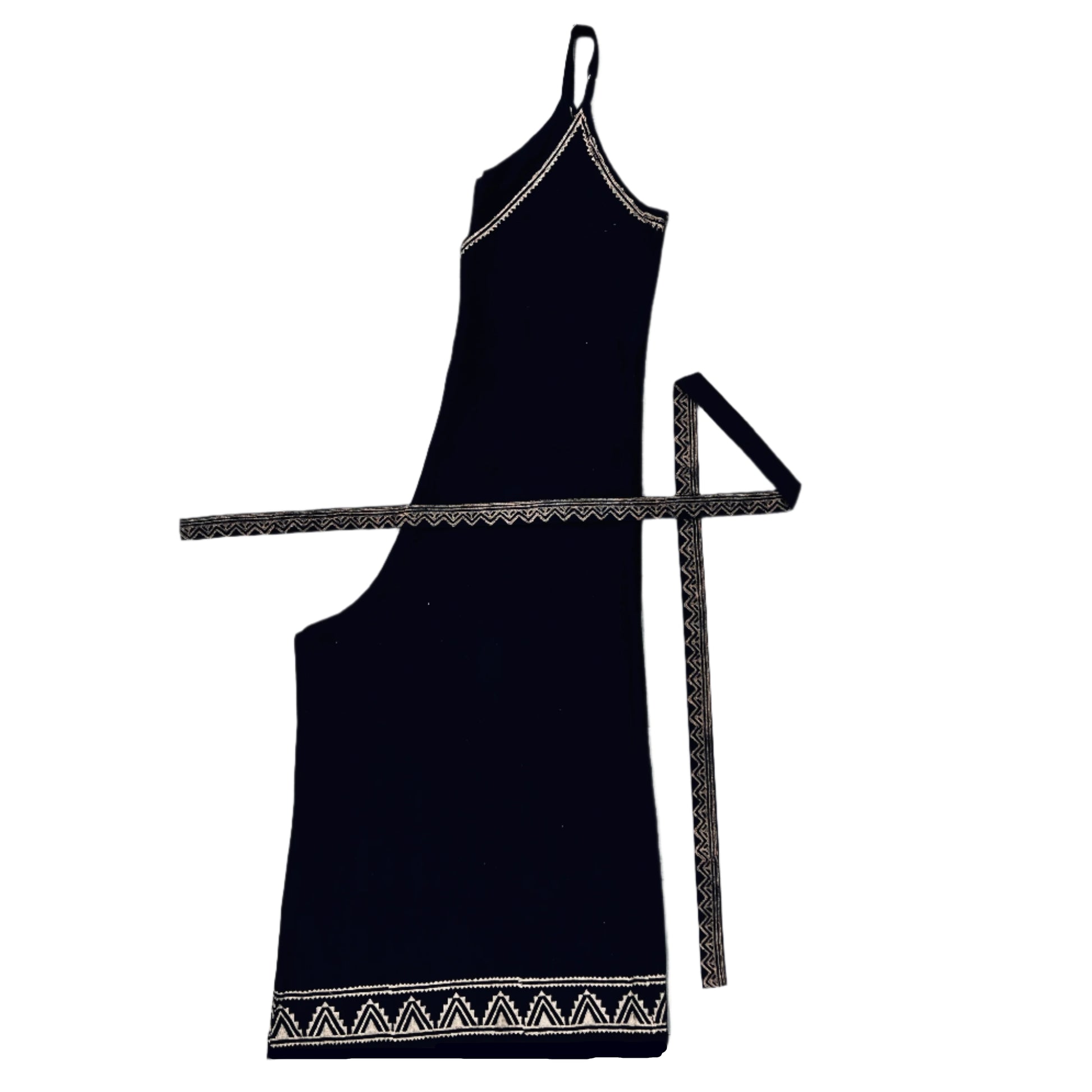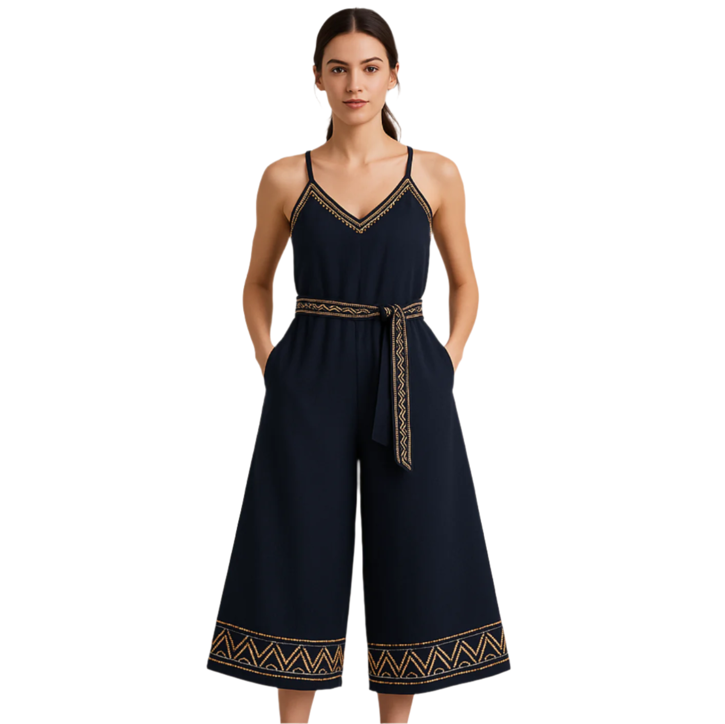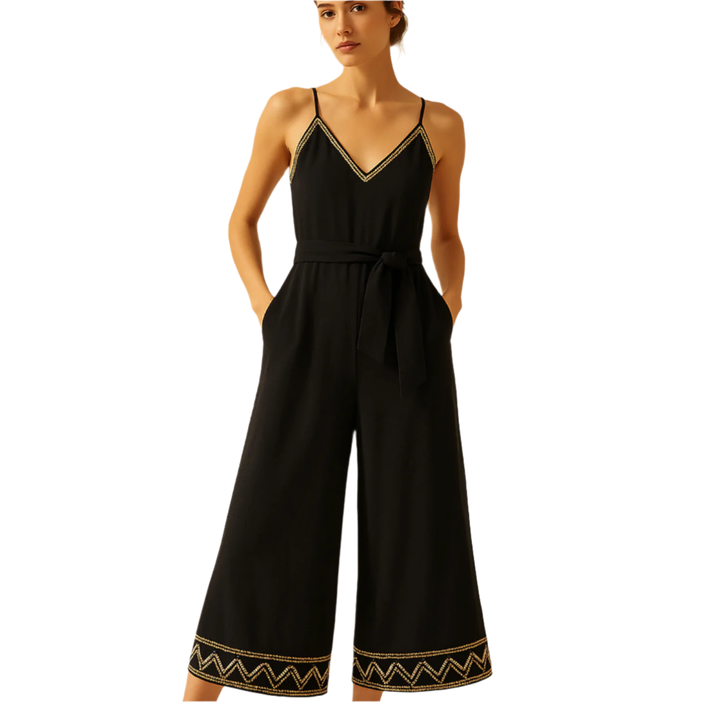 Mono largo de escote pico y tirantes finos cruzados en espalda. Bolsillos laterales ocultos en costura. Cinturón ancho ajustable.